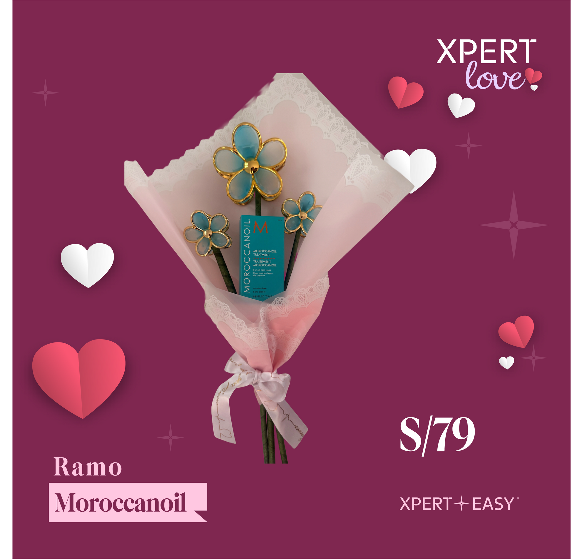 Ramo contiene 3 Ganchos en forma de flor y 1 Tratamiento Moroccanoil 25ml